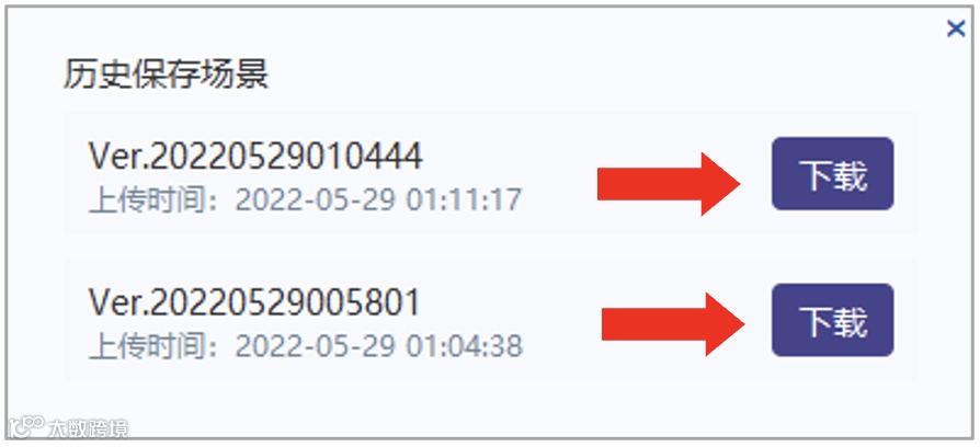 6.文件保存可在场景资源中点击“保存场景”,调取保存的文件可点击“历史版本”