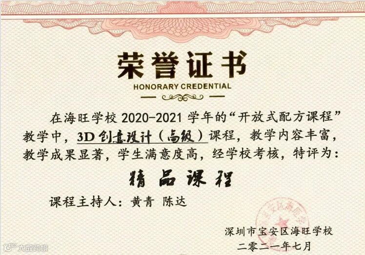 实际上,刘钦洋和胡桐源所取得的成绩不仅是海旺学校近年来科技创新教育成果的一个缩影,也是海旺学校全方位育人体系的一次展现。海旺学校自办学以来,一直坚持科技创新教育,并借助3D One系列科技创新教育软件及中望创新教学平台(SIM云)等,大力开展三维创意设计、人工智能与编程等实践活动,培养学生科技创新精神和实践能力。短短几年时间内,海旺学校学生科创教育亮点频出,先后在全国、省市区各级各类科技创新大赛中屡获佳绩。