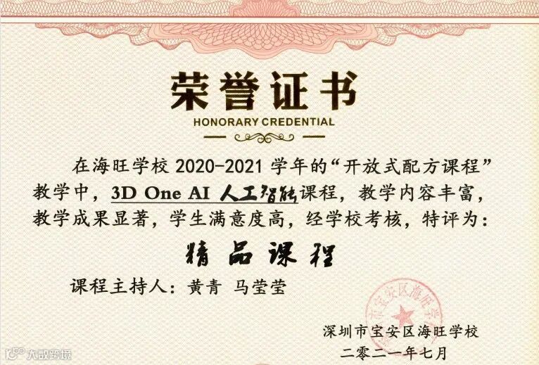 在不断的探索下,海旺学校构建了科技创新三级课程体系,包括:1.普及性的科技创新类配方课程;2.以初中两年为周期的体系课;3.贯穿九年义务教育过程的校队训练课。每个层级的课程每周固定专门的时间,为学生提供体验式教学,引导学生从理论学习进入到动手实践,增强学生的实践操作能力。至今,海旺学校在小学部和初中部开设了“人工智能编程”6个科创特色班、3D One AI(人工智能与三维仿真)和3D One cut (激光切割)4个配方课程班,每周1节课。