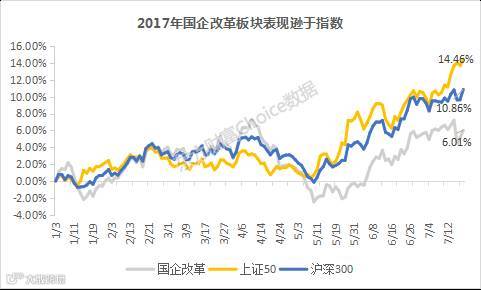 当前市场对国企改革的主题预期相对较低,概念板块的走势表现也较为一般。2017年至今,国企改革指数的涨幅约6%,尽管取得正收益,但涨势不及沪深300(10.86%)和上证50指数(14.46%)。上半年,监管趋严导致投资者风险偏好下降,资金抱团白马龙头股令国改主题失色。