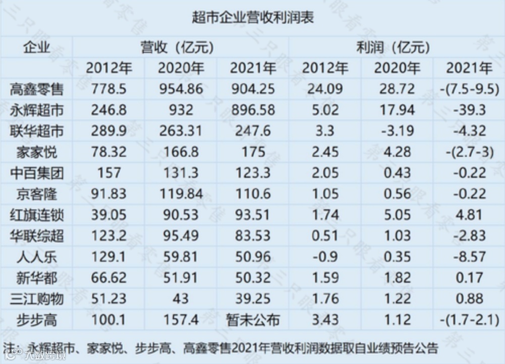 纵观上市超市发布的2021年年报,12家上市超市就有9家出现亏损,平均亏损金额超过5亿元,作为行业标杆的永辉超市和高鑫零售更是出现上市以来的首次亏损。引用《第三只眼看零售》的追踪数据,超市行业自2012年以后就已进入下滑时期。