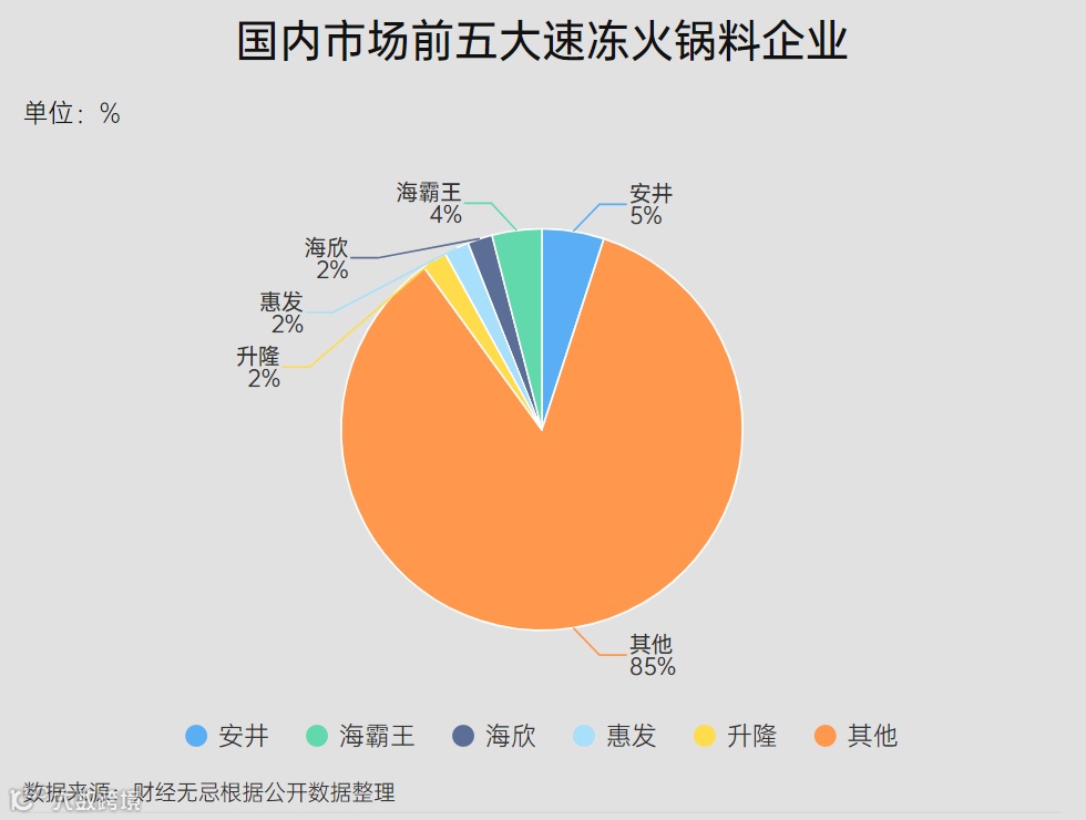 火锅料市场尽管作为速冻食品的增量,但根据国联证券的研究报告,其市场分散性依旧很强。国内市场前五大速冻火锅料企业分别为安井、海欣、海霸王、惠发和升隆,其中安井也仅占据市场5%左右的份额,排名第二的海霸王占比已达到4%。