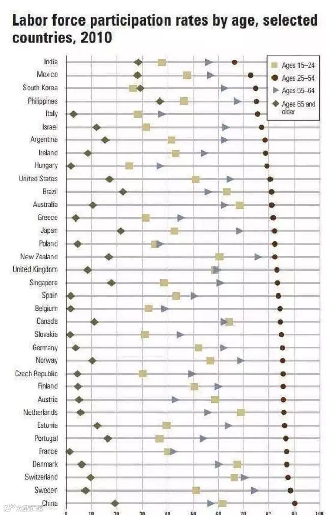 世界各国各年龄层的劳动参与率,中国达到惊人的90%,位列世界第一