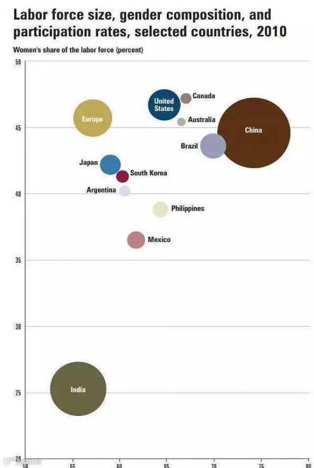 此表是世界各国男性女性劳动参与率,深色方形代表男性,浅色圆形代表女性。中国男性的劳动参与率一路领先,达到90%,和巴西、菲律宾、印度等国齐名;中国女性的劳动参与率近70%,一骑绝尘,世界第一。