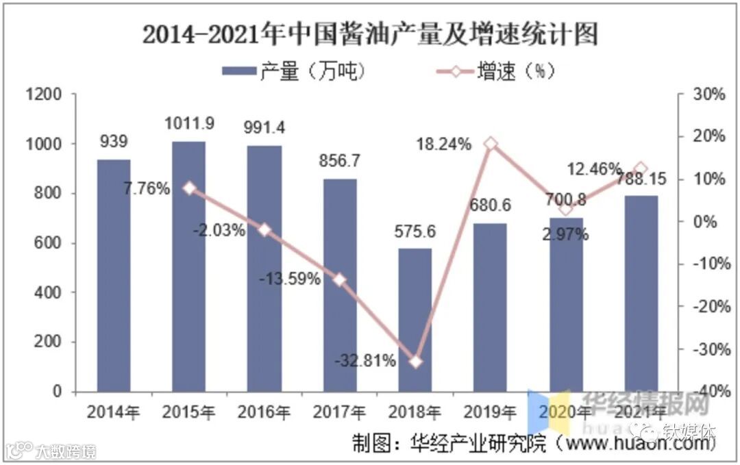 (中国酱油产量及增速,来源:华经产业研究院)