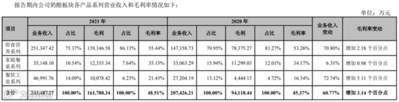 2021年,公司营收44.8亿,同比增长57.31%,净利润1.5亿,同比增长160.60%。奶酪板块营收33.3亿,其中奶酪棒的即食营养系列25.1亿,餐饮工业4.7亿,家庭餐桌3.5亿。