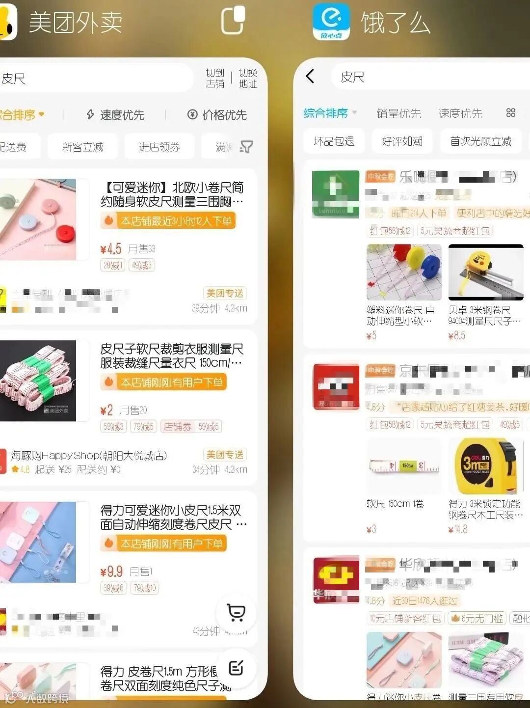 “前两天因为突然要量一个东西,所以需要一个皮尺。但又不想出门,所以就在美团外卖和饿了么搜了一下,最终美团外卖搜索出来的结果较多,有我需要的皮尺,并且款式多样,而饿了么虽然有皮尺商品,但款式单一而且翻了一下就开始出现钢尺、卷尺等其他产品,最终就在美团下了单。”消费者秋秋表示。
