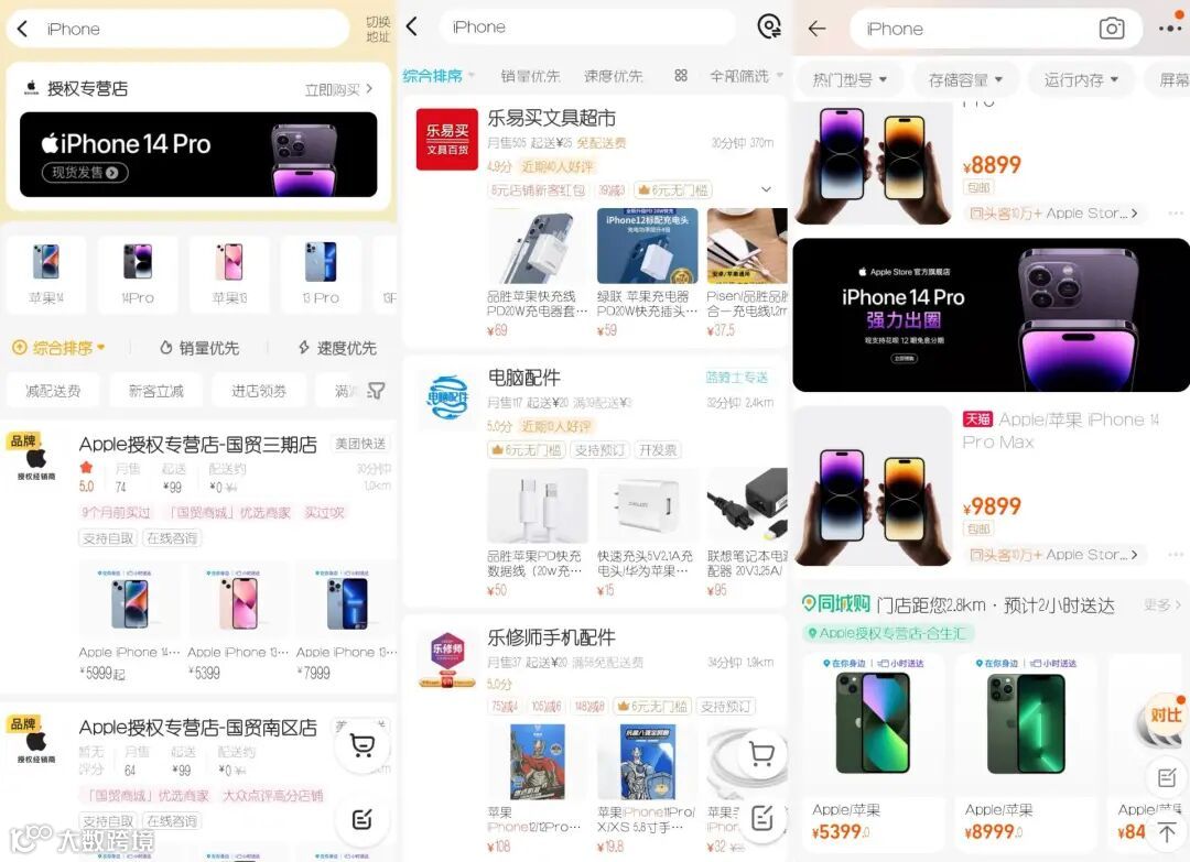 阿里的饿了么、淘鲜达、天猫超市、盒马等业务线都涉及即时零售业务。9月16日,燃次元尝试在淘宝平台搜索“iPhone”,下滑至第二屏时也看到标志着“同城购”的iPhone 14相关产品,该产品显示由“Apple授权专营店”提供,预计2小时送达。