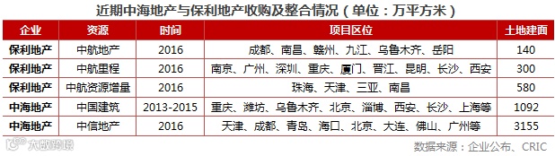 与保利地产不同的是,中海地产早在2013年就与母公司中建宣布了整合,并于2015年最终尘埃落定。中海地产获得了中建338亿元的资产,土地储备近1092万平方米。2016年整合完毕的中海地产,还收购了中信的地产业务,一次性得到了近3155万平方米的巨额土地资源,截止2016年底中海地产(不包括中海宏洋)共拥有土地储备5677万平方米。