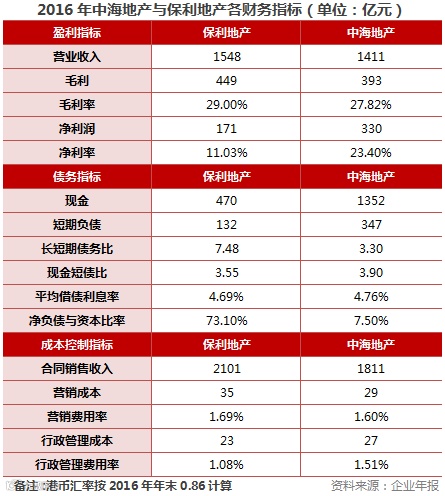 从盈利指标来看,2016年中海地产净利润达到了384亿港元(按年末汇率0.86约人民币330亿元),比保利地产高出了近150亿元,此外中海地产的净利率达到了23.40%,相比保利地产高出了12个百分点,维持在整个行业的较高水平,是名副其实的“利润王”。在成本控制方面,两家企业都有较好的成本把控。营销费用率方面中海地产略低于保利地产,为1.60%。而在行政管理费用里,保利地产则低于中海地产,为1.08%。