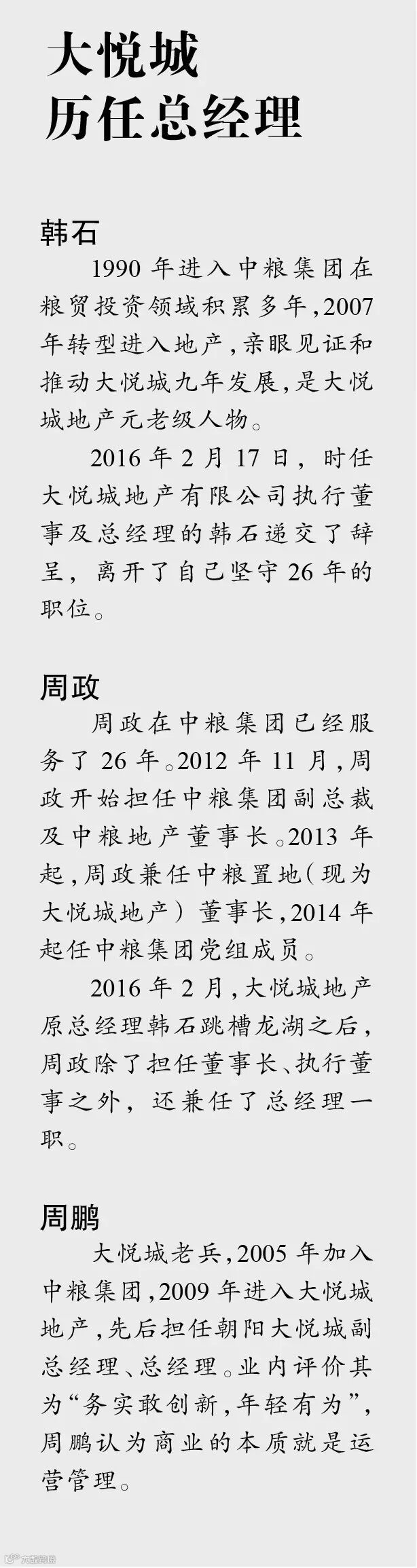 韩石的离职开启了这一系列的人事变动。在加拿大留学并工作多年,韩石1990年进入中粮集团在粮贸投资领域积累多年,2007年转型进入地产,亲眼见证和推动大悦城9年发展,是大悦城地产元老级人物。