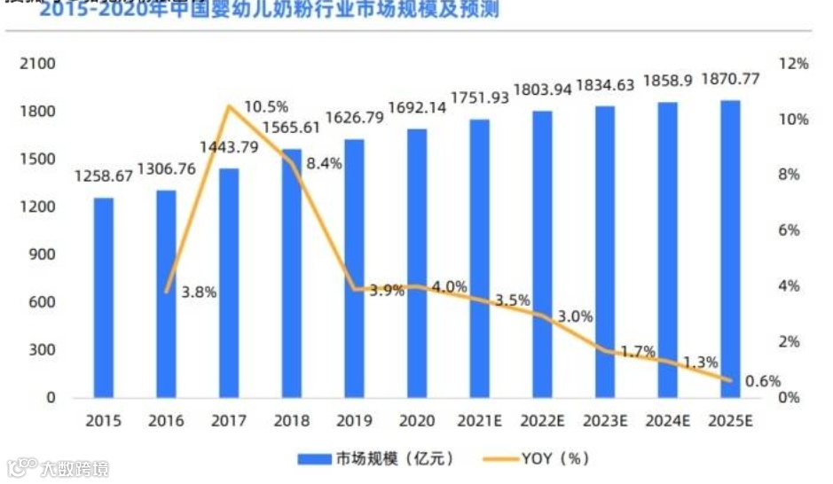而在奶粉市场内,随着国家二胎、三胎政策的不断落地,也利于整个国产品牌的发展。根据《2015—2020年中国婴幼儿奶粉行业市场规模及预测》显示,中国婴幼儿奶粉市场销售规模从2015年1258.67亿元增至2020年1692.14亿元,并预计2025年将达到1870.77亿元的市场规模。