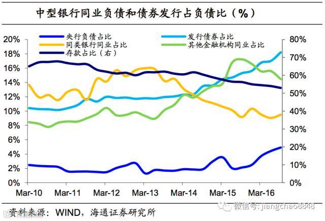 15-16年:同业存单兴起,主动负债增加。14年同业存单开始大量发行,开启了银行间存单利率市场化。同业存单的大量发行,使得银行资产负债表重新扩张,金融部门的同业+债券债务率从50%上升到67%。其中,债券发行与GDP之比从13年的18%明显上升至16年末的27%。截至17年3月末,存单余额达到7.78万亿,中小银行发行比例达到50%-60%。