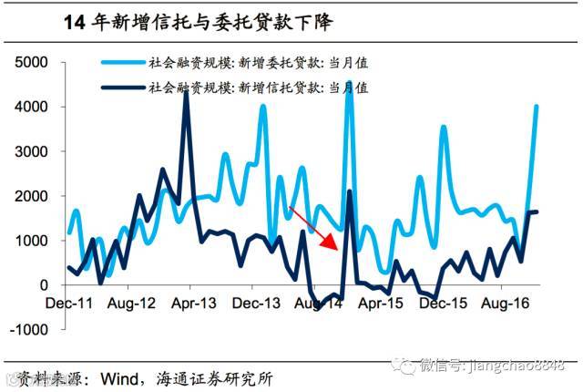13年上半年,社融新增信托和委托贷款达到2.35万亿,约等于12年全年新增量。银行理财对接非标资产,规模迅速扩张,在这一阶段,非标资产能够提供8%-10%甚至更高的收益,实体经济通过委托、信托贷款等,为5%以上的理财收益提供了支撑。