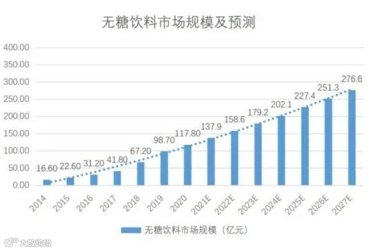》显示,2020年无糖饮料市场规模达117.8亿元,较2014年翻了7倍;2025年该市场将增至227.4亿元,5年内实现规模翻番;2027年,该市场将继续攀升至276亿元规模。