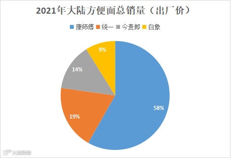 2021年康师傅方便面销售额284亿,统一方便面90亿,今麦郎方便面70亿,白象40亿。