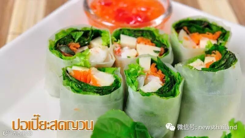 泰式春卷跟中国的不太一样,薄薄的面皮里面裹上荤的素的各种菜,有时可能会有薄荷、香菜、生菜等样样戳心的食材,如果你爱吃就极易爱上,如果不爱吃就极易嫌弃。