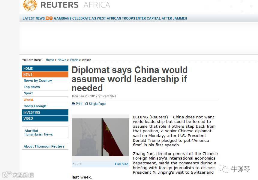 路透社就报道说,中国外交部国际经济司司长张军23日在谈到中国角色时说,中国无意寻求全球领导地位,“如果有人说中国正扮演着世界领导者的角色,我要说,并不是中国要冲到前面,而是前方的领跑者退后,给中国留了位置”。