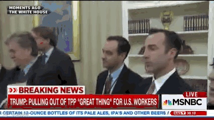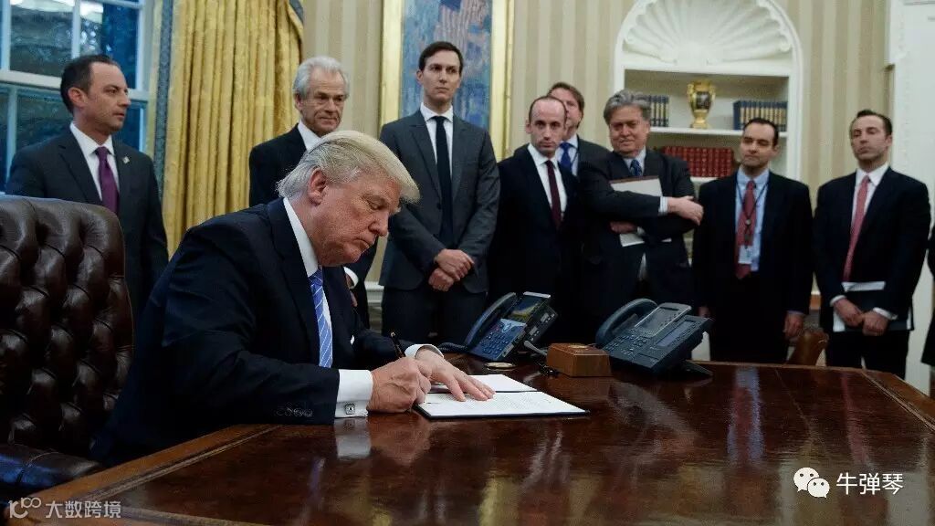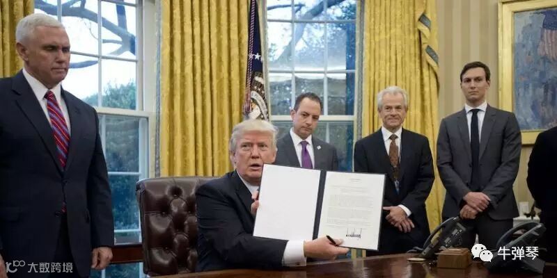 很有意思的一个看点,就是在电视画面上,特朗普坐在椭圆形办公室的总统办公桌前,对着镜头宣布:今天,我将签署三个行政命令,第一个就是退出TPP。