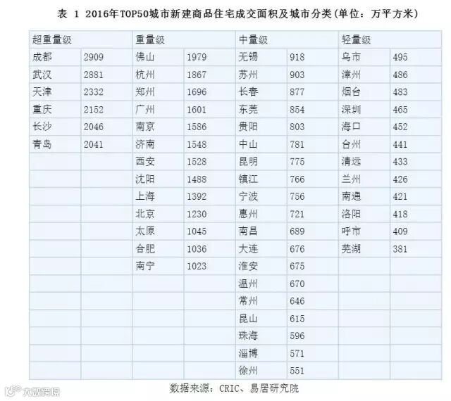 基于不同的成交面积,以及考虑到2016年房地产市场较为火热的因素,我们对TOP50城市进行了分类,如下表。分类标准为:1、超重量级城市:成交面积超过2000万平方米。2、重量级城市:成交面积介于1000-2000万平方米之间。3、中量级城市:成交面积介于500-1000万平方米之间。4、轻量级城市:成交面积低于500万平方米。
