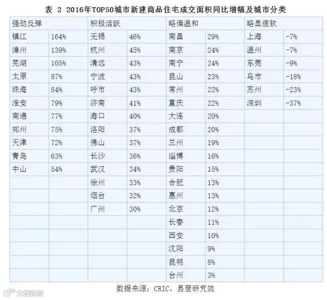 基于不同的成交面积同比增幅,我们对TOP50城市进行了分类,如下表。分类标准为:1、强劲反弹:同比增幅超过50%。2、积极活跃:同比增幅超过全国平均水平(2016年全国商品住宅成交面积同比增幅为22.4%),我们将其定义为30%-50%的区间。3、略偏温和:同比增幅介于0%-30%的区间。4、略显疲软:同比增幅低于0%。