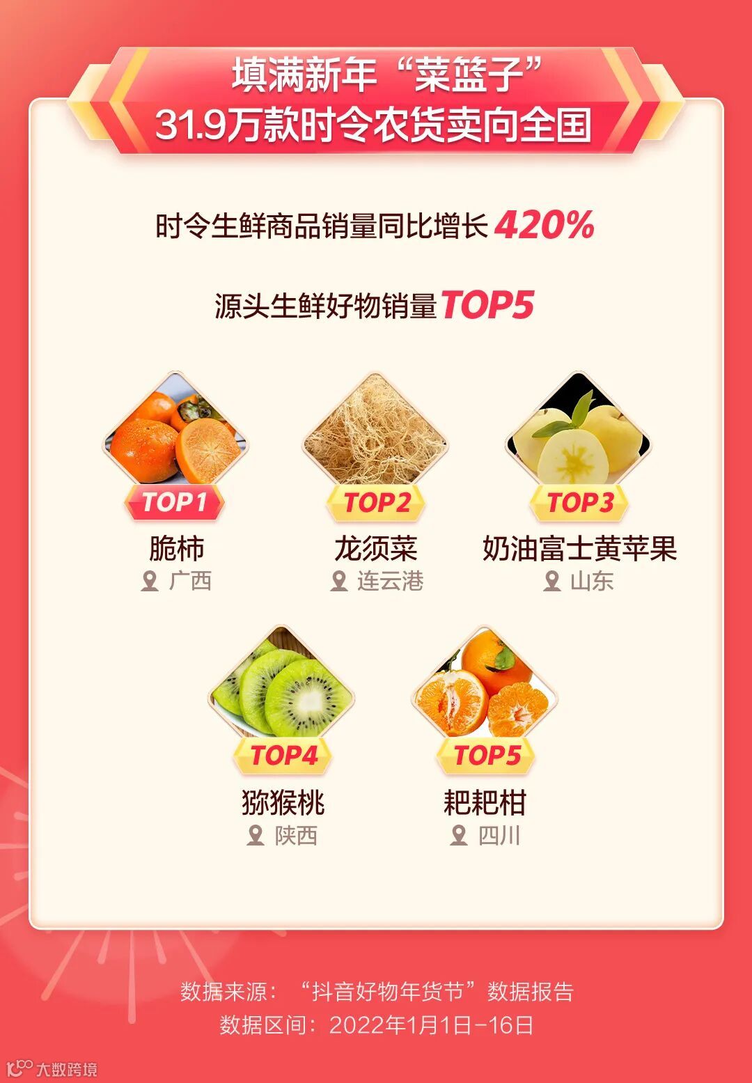 其中,抖音电商与全国23个省(自治区、直辖市)合作,带动销售301.9万单地方好物。年货节期间,抖音电商上线了31.9万款时令农货,生鲜类农特产销量同比增长420%。