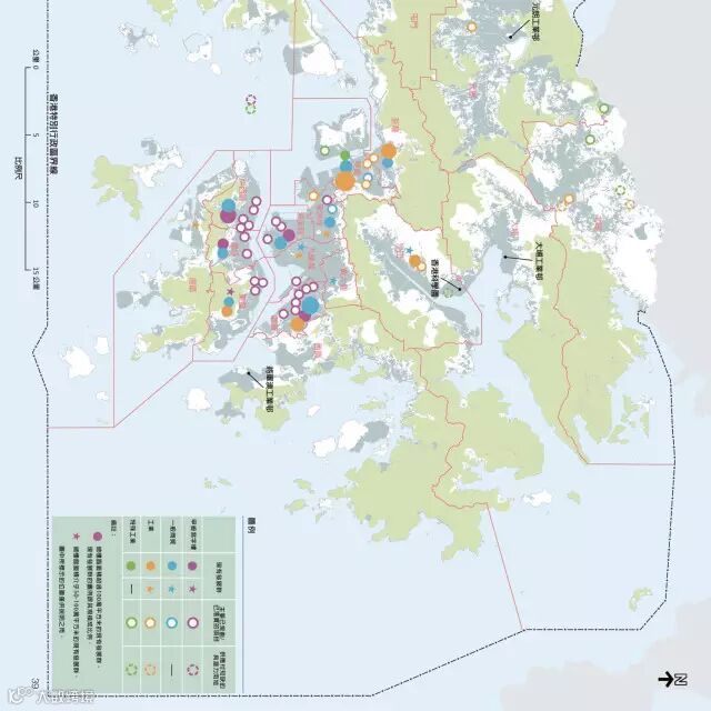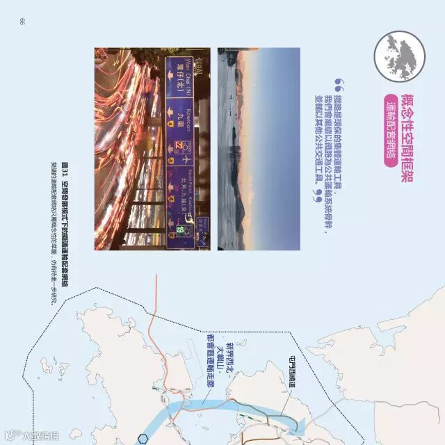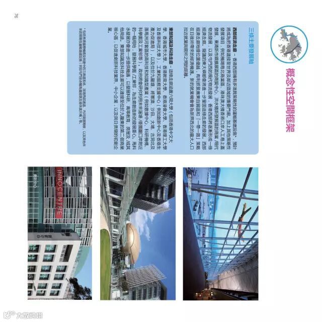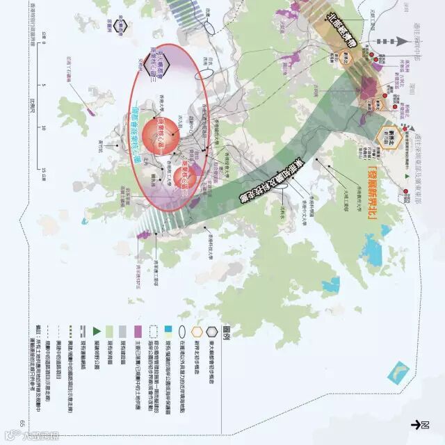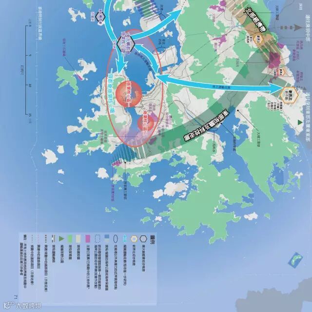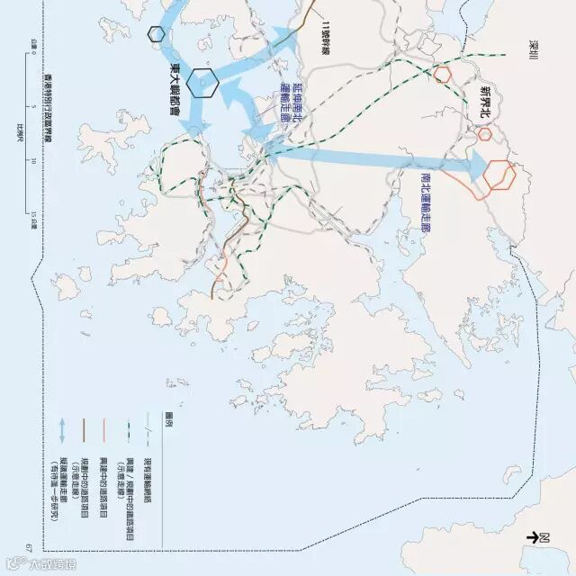 都会商业核心圈涵盖围绕维多利亚港的传统商业核心区、第二个商业核心区九龙东,以及拟议东大屿都会的第三个商业核心区。两个策略增长区分别是东大屿都会和新界北。逐渐形成的发展轴包括西部经济走廊、东部知识及科技走廊和北部经济带。