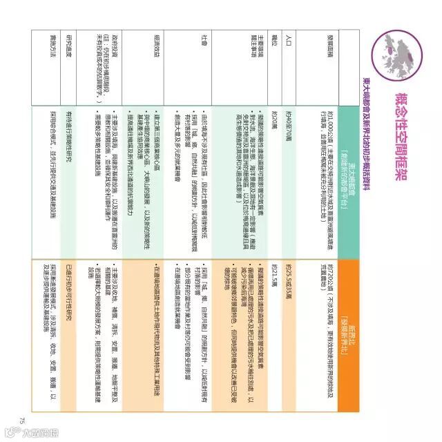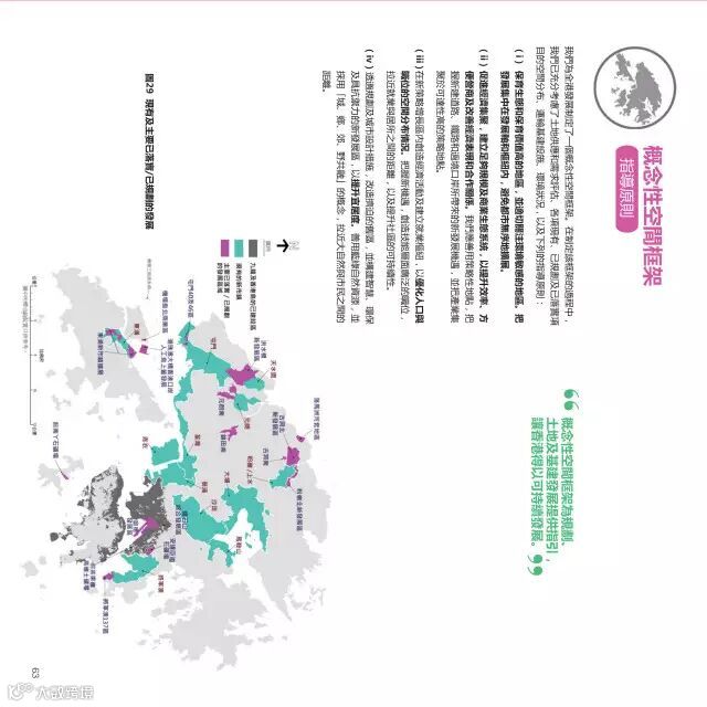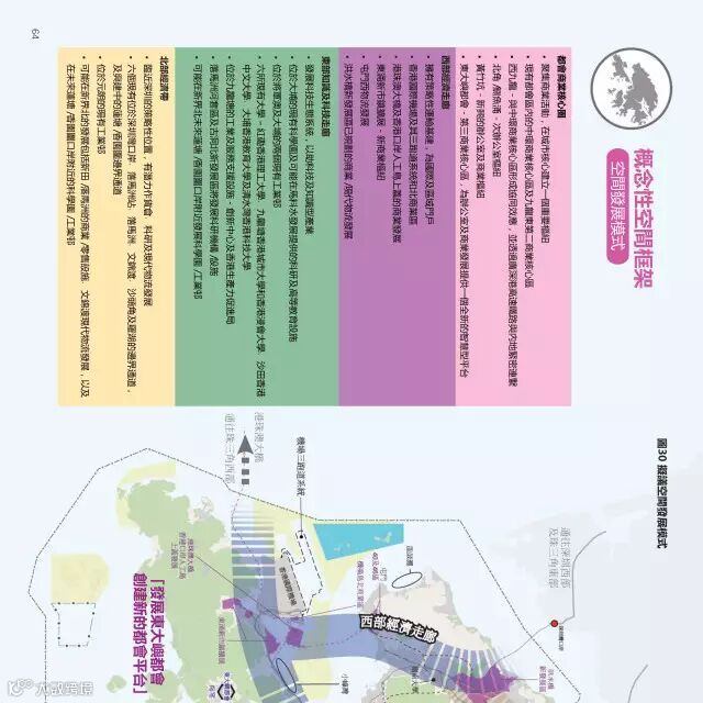 为达到规划目标,《香港2030+》建议了一个概念性空间框架,包括一个都会商业核心圈、两个策略增长区、三条主要发展轴,同时保育我们的天然资源和提升宜居度。