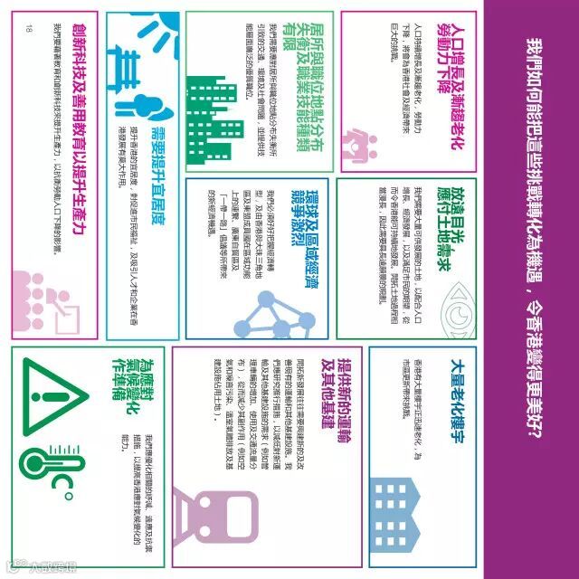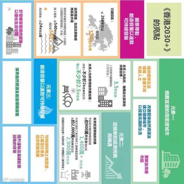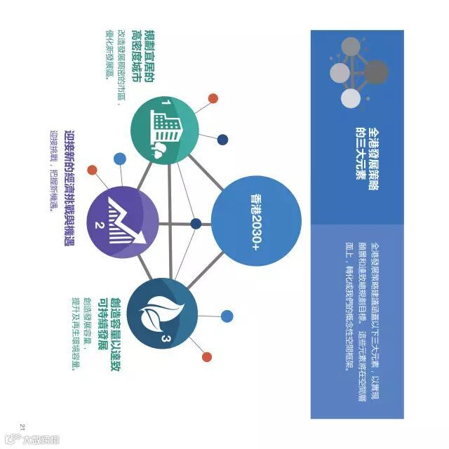 为了实现这个愿景,《香港2030+》主要建议包括三个规划元素:提升我们作为高发展密度城市的宜居度、迎接经济挑战与机遇,及创造容量以达致可持续发展。