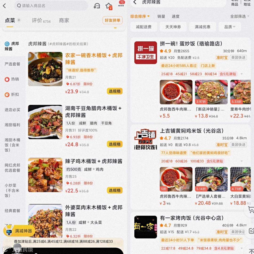 我们点开美团进入外卖窗口,搜索虎邦辣酱,页面弹出的窗口出现不少商家,但这些商家并不是主卖辣酱,而是与页面菜单的菜品深度绑定。