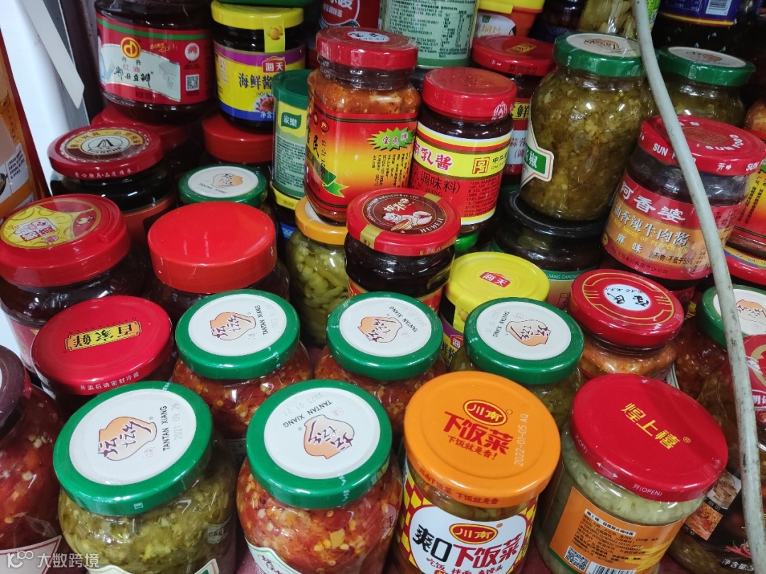 武汉市广埠屯菜市场,往里走入内靠近右手的一侧,一共有三家干杂店,每一家店里,左侧拥挤又狭窄的货架上摆放着各式各样不知名的酱料,川香居的麻辣拌菜料、胡和记的麻辣面调料、坛坛乡的豉香朝天椒……