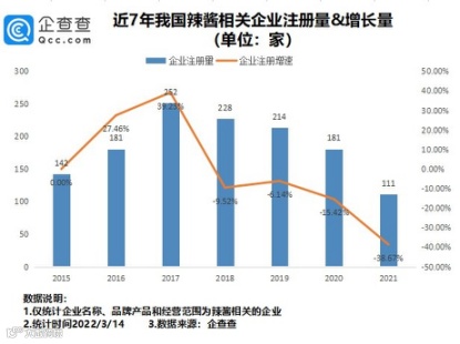 企查查数据显示,我国现存辣酱相关企业1213家。近7年来,我国辣酱相关企业注册量呈现波动变化。