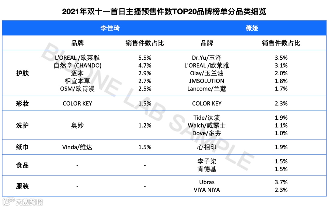 薇娅直播间销售品类覆盖更全面,玉泽、欧莱雅、玉兰油、Colorkey、ubras、李子柒等品牌居前列。