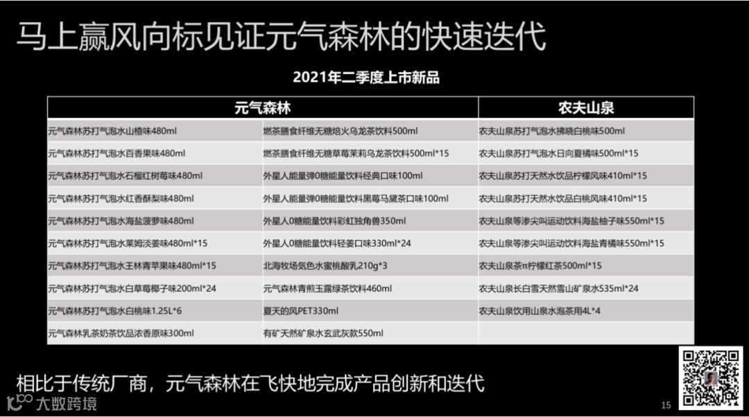 每一列是10行,元气森林的话,在今年第二季度全新上了20个条码,如果去掉大包装的话有13个,可以看到大量的口味在测试。
