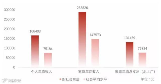 而在家庭收入层面上,新社会阶层过去一年的家庭总收入均值达到288826元,是社会平均收入147573元的1.96倍。