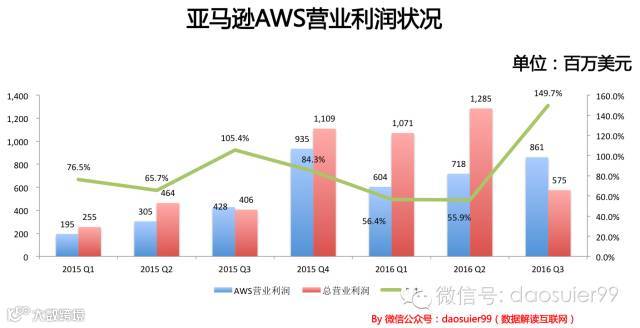 从2006年亚马逊专门成立网络服务部门开始,随着外界对其云计算业务预期的不断增强,亚马逊的股价也不断创出新高。未来的一切都是基于云端的,云计算行业的市场空间可能比电子商务还要大,而亚马逊则经过数年的耕耘在这一市场上已经处于绝对领先的地位。2015年,亚马逊首次在季报中批露了其来自于云计算业务AWS的营收情况。从下面这些数字你可以看出,AWS的营业收入在快速增加,更重要的是来自于AWS的营业利润已经基本上可以说超过了电商,成为了亚马逊营业利润的主要来源。AWS的成功再造了一个甚至可能是N个亚马逊。