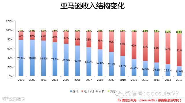 其次亚马逊以交易为核心连接了越来越多的品类和对应的目标人群。众所周知,亚马逊从图书起家,在图书市场站稳脚跟之后,亚马逊一直没有停止自己品类拓展的步伐。人们也越来越愿意将亚马逊当成自己的消费入口,在亚马逊上购买商品的种类越来越多。这从亚马逊的收入结构中就可以看得出来,亚马逊长久以来一直是以图书为核心的媒体业务为主,但是自电子与日用百货品类上线后增速很快,2010年其营收占比首次超过了媒体,成为亚马逊站内的第一大品类。这其实是非常重要的一件事,显示了亚马逊电商平台的扩展性和包容性。现在亚马逊还在不断地开拓一些更有潜力的品类,例如生鲜、数字影视等,这都将会进一步提升亚马逊的平台规模和交易属性,让其电商平台变得更加庞大。