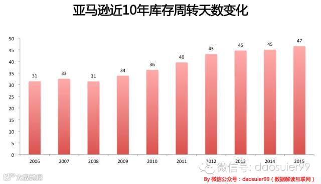 在电商行业,还有一个很重要的指标是库存周转天数,反映了企业货物销售的效率。从这个指标上来看,亚马逊也没有变得更好,从2011年开始库存周转明显变得更慢了。