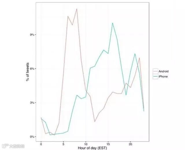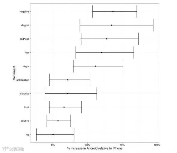 不仅用词有别,来自Android手机以及iPhone所发的推文,在情感上也有很大差异。
