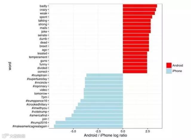 这一点,引发了数据分析师David Robinson的注意。他也发现,川普发表祝贺内容时,是透过iPhone;而用来抨击选战对手时,则是透过Android手机。