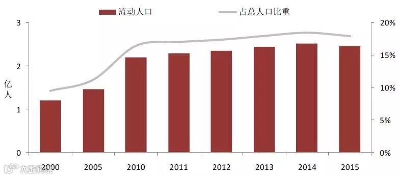 流动人口规模不断扩大。随着经济活动和城镇化发展,流动人口规模不断增长。截至2015年末,我国总人口13.7亿人,较2005年增加0.67亿人,流动人口规模达到2.47亿人,较2005年增加1亿人,占总人口比重由2005年的11.2%提高至18%。按照《国家新型城镇化规划》的进程,到2020年我国仍有2亿以上的流动人口。