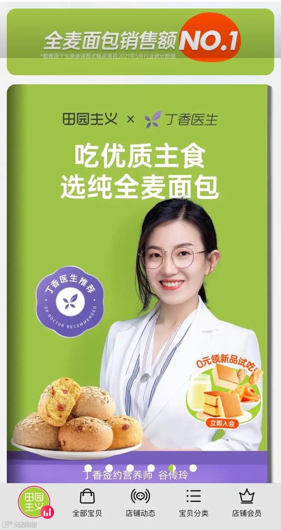旗舰店首页的广告海报上,还贴有“丁香医生推荐”的标签。此前,田园主义与丁香医生曾联名推出过一款全麦面包礼盒。