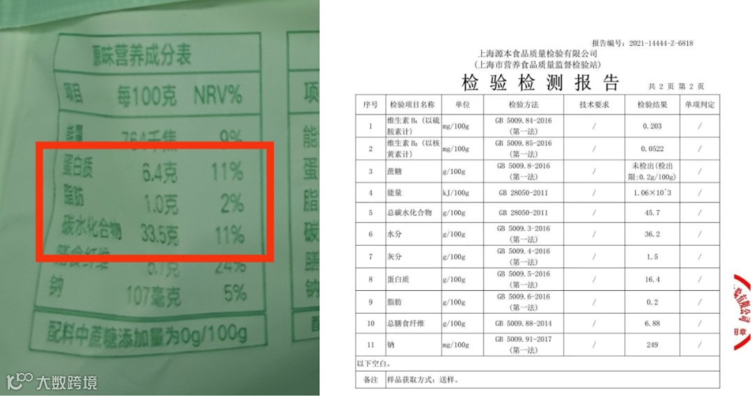 此外,根据检测报告数据,其蛋白质和钠也与标示值不符,实测值分别为标示值的256%和233%。