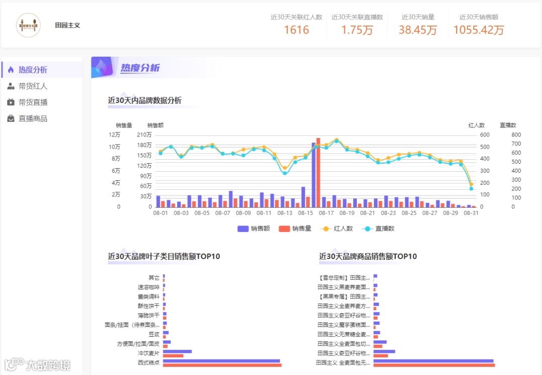 小葫芦大数据显示,近30天,有1616位主播曾为田园主义带货,销售额超千万。