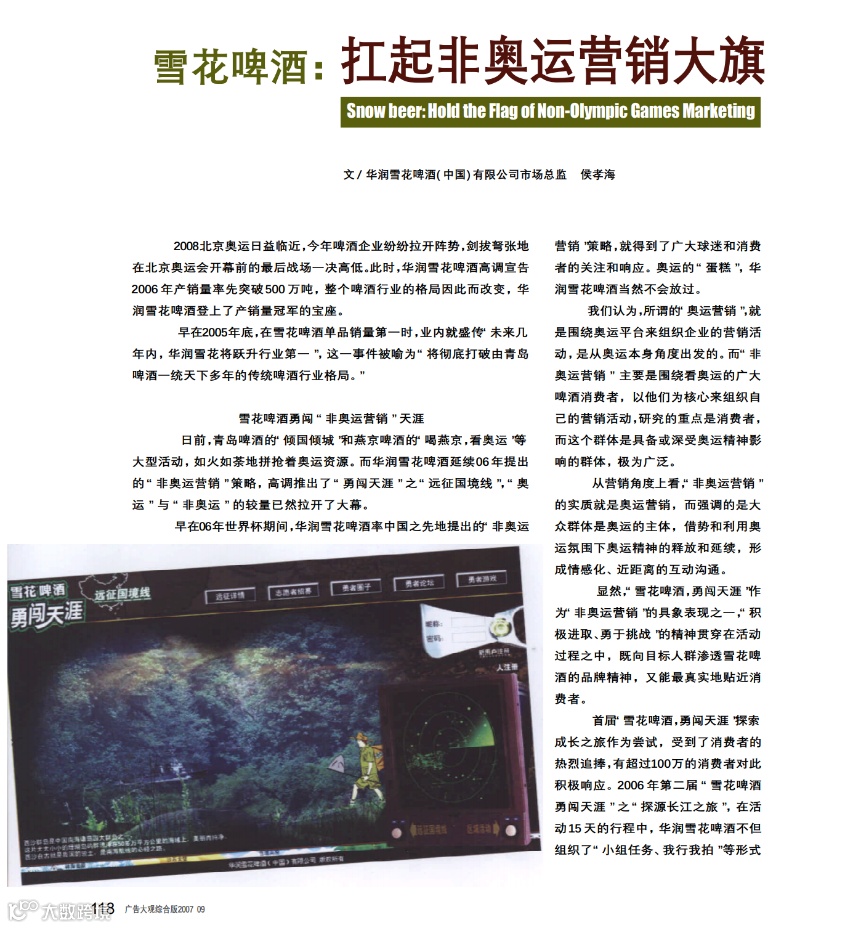 (侯孝海发表文章《雪花啤酒:扛起非奥运营销大旗》)