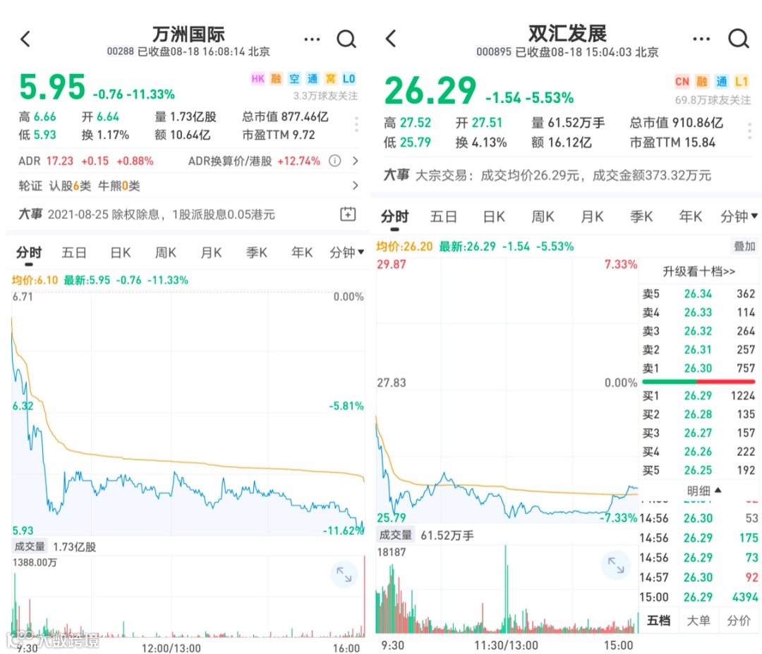 截至8月18日,“双汇系”两家上市公司股价大跌,港股的万洲国际受到重挫,大跌11.33%,最终收报5.95港元/股;A股公司双汇发展则一度下跌超7%,最终收报26.29元,较前一个交易日下跌5.53%。