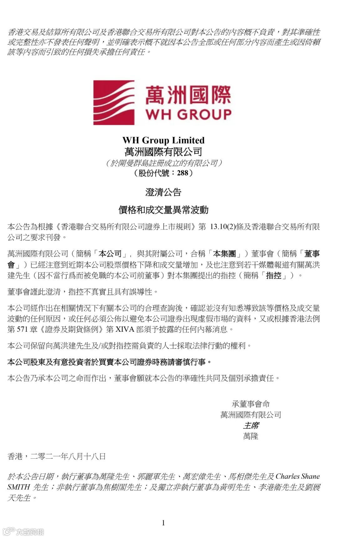 “公司已经注意到近期本公司股票价格下降和成交量增加,及也注意到若干媒体报道有关万洪建先生(因不当行为而被免职的本公司前董事)对本集团提出的指控。