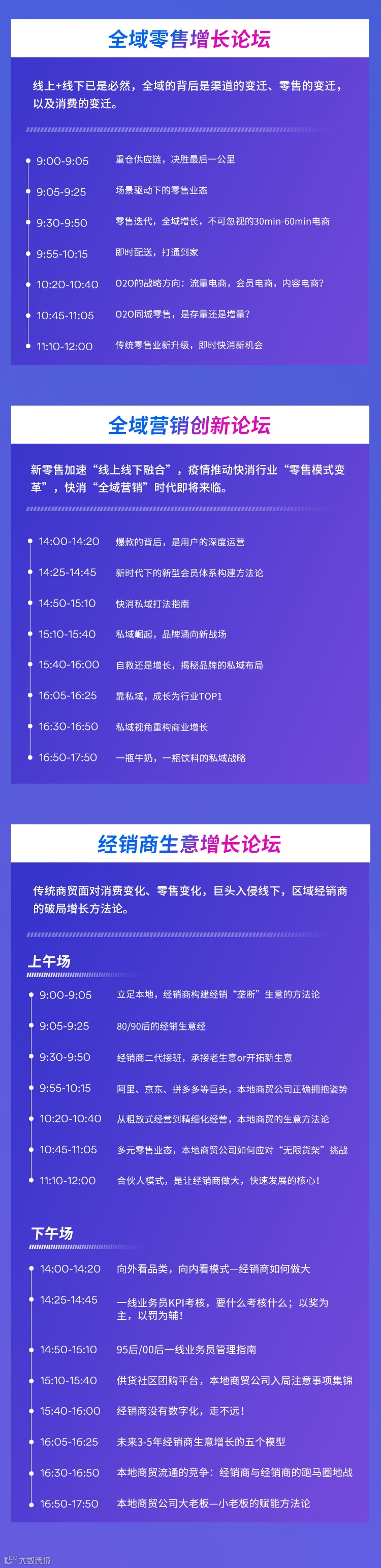 10个主题论坛涉及新零售O2O,社区团购,短视频直播电商,经销商转型,新消费品牌崛起,新酒饮解读,经销B2B供应链,全域营销,B2B2C新技术应用等,各细分领域操盘手带着最新案例解读而来。