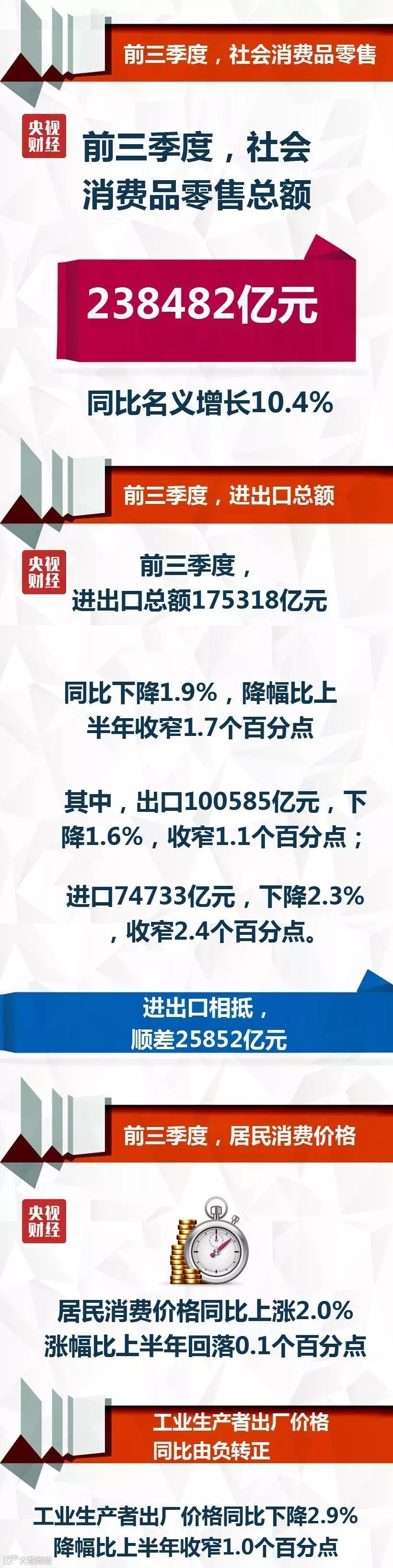 前三季度,社会消费品零售总额238482亿元,同比名义增长10.4%(扣除价格因素实际增长9.8%),增速比上半年加快0.1个百分点。