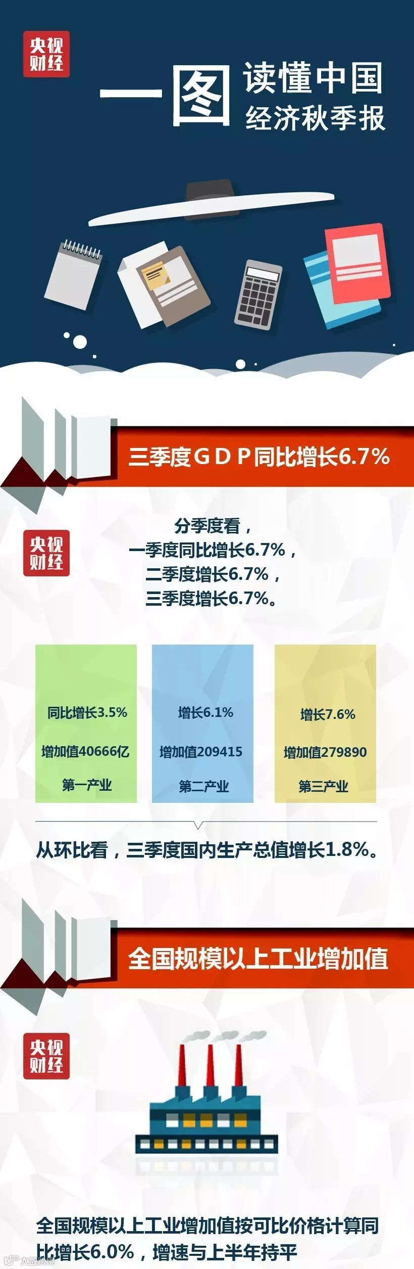 央视记者记者 柴华:今天公布的三季度GDP为6.7%和一二季度持平,我们可以想象三个季度经济增速运行在一条直线上,似乎看不出什么不同,但是这条直线却蕴含着不同的质量博弈,也就是说三季度的6.7%比一二季度的6.7%在含金量上更高!